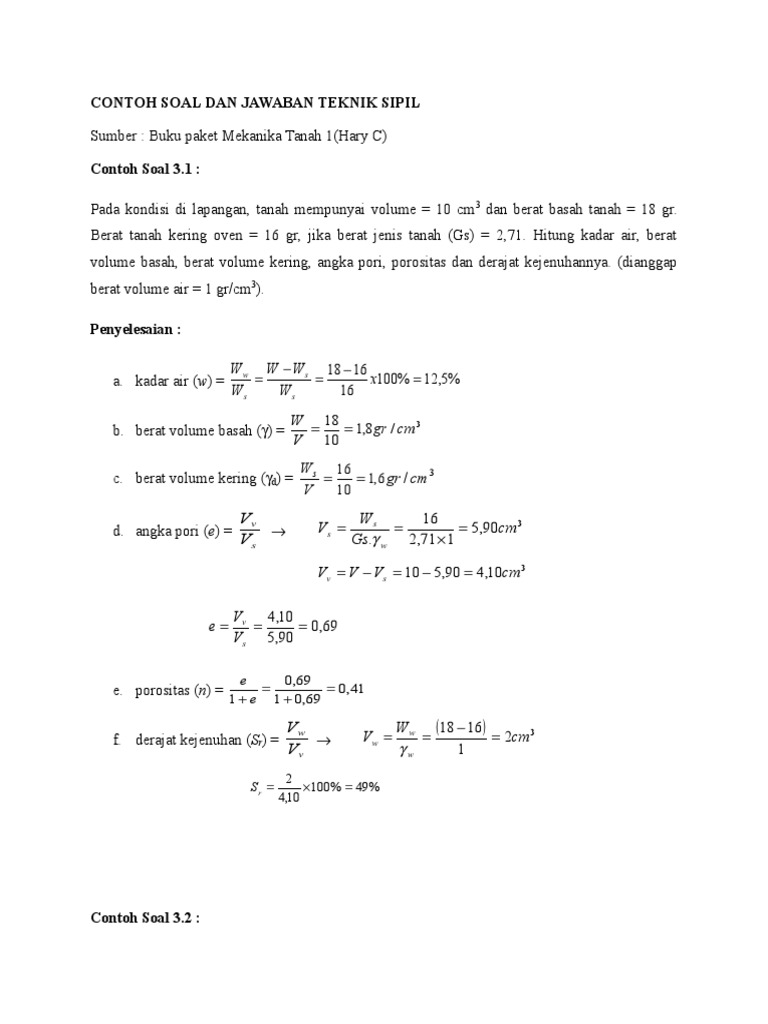 Contoh Soal Ekonomi Teknik Sipil Dunia Sosial from blog.ruangguru.com Tulis namamu di sudut kanan atas. Perkolasi (p) di sawah dianggap sama pada setiap bulannya, yaitu sebesar 3 mm/hari. Bank soal ujian kompetensi dasar teknik sipil ft. Bingung bikin video daring seminar proposal skripsi? 20200930 modul 5 daya dukung tiang tunggal pdf free download teknik sipil w i n n i l i c i o u s daya dukung pondasi dengan analisis terzaghi bahan uts bahan ajar pondasi 2 contoh soal pondasi dangkal pdf document. Contoh soal dan jawaban teknik sipil. Setelah kita membahas berbagai contoh soal tes kompetensi dasar tkd di 110 contoh. Pada kondisi di lapangan, tanah mempunyai volume = 10 cm3 dan berat basah tanah = 18 gr.